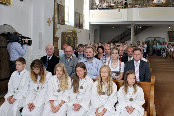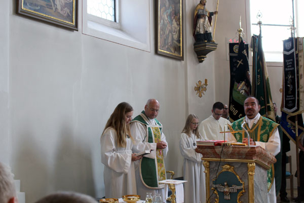 Vertretung aus dem Kloster Windberg Pfarrer Drexler hieß die ganze Kirchengemeinde der Pfarreiengemeinschaft herzlich willkommen insbesondere die Vertreter der Politik mit Bürgermeister Andreas Eckl, die Gemeinderäte und das frühere Gemeindeoberhaupt Xaver Eckl. Herzlich willkommen hieß er auch den ehemaligen Pfarrer Johann Christian Rahm und Frater Felix und bemerkte, dass dieser nach der Kommunion in Vertretung von Schirmherrn Abt Hermann Josef Kugler eine Ansprache halten wird. „Nun wollen wir mit dem Gottesdienst den Dank für unsere Vorfahren einfließen lassen“ und für sie ein Dankopfer feiern, so der Pfarrer. Musikalisch