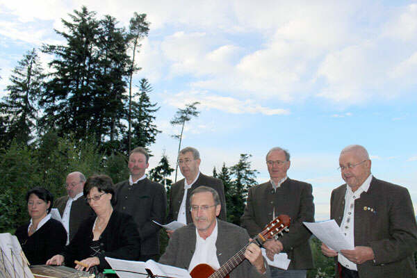 Dann trugen die Grüabig´n zum Gloria die Weise vor, in der es heisst: „Zum Herrgott stehn mir fest und treu, wia d´Baam im Houwoid drob´n. Wia foin net um, mia foin net glei, wenn d´Weeda sich austob´n „. Bei der Predigt meinte Pfarrer Drexler, der Regenbogen, der plötzlich über der Bergeinsamkeit stand, sei ein Zeichen vom Himmel und er bat schließlich die Anwesenden, man möge sich als Schwestern und Brüder erweisen und einander vertragen. Mesnerin Gerlinde Zweck trug die Lesung vor und Kirchenpfleger Ferdl Klement blickte in den selbstgefassten Fürbitten zurück auf die 900-Jahrfeier und schloss alle ein, ob Bürgermeister, Gemeinderat, Vereine und alle Bürger der Pfarreiengemeinschaft und sprach die Hoffnung aus, dass man weiterhin mit dem Kloster Windberg freundschaftlich verbunden bleiben möge. „Kircherl am Wies´nroi, hoch do heroben, wer die´vo´ kloa af kennt, kimmt her zum Loben" , stimmten am Ende die Griabig´n ein. „ Nach dem Segen dankte Pfarrer Drexler den Sängern und Sängerinnen und bemerkte: „Es war eine schöne und würdige Feier". Schließlich übermittelte er zum Schluss herzliche Grüße von Pfarrer Rahm und die Gläubigen zollten einen langanhaltenden Applaus. |
