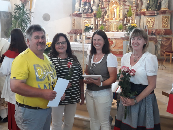 dieses lebenslange Gelöbnis – passend umrahmt von Klängen aus der Querflöte Tanja Jänicke-Stögers. Mitglieder des Pfarrgemeinderates Moosbach-Prackenbach-Krailing überreichten kleine Erinnerungsgeschenke: Rosen und Urkunden mit kleinen