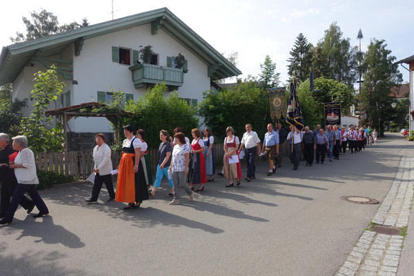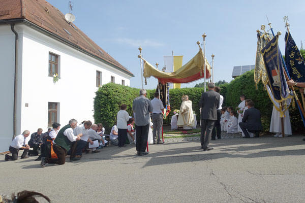 | Wie zum „Kranzltog“ oder „Prangertog“ üblich, zieht die Pfarrgemeinde durch die Straßen des Dorfes. Die Monstranz, welche den Leib Christi zeigt, trägt der Priester oder der Diakon unter dem „Himmel“. Die vier Himmelträger, die den Baldachin tragen werden von den Ministranten und den Erstkommunionkindern begleitet. | |||||