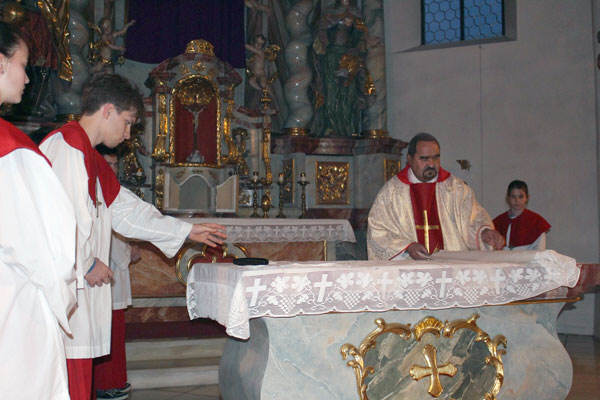 | Die beiden Lesungen trugen Marianne Vogl und Maria Rackl vor und der Kirchenchor unter der Leitung von Walter Stöger sorgte für musikalische Mitgestaltung. Nach dem Gloria verstummte jedoch die Orgel und die Ratschen übernahmen für den Rest des Gottesdienstes die Schellen der Ministrangen. In seiner Predigt erwähnte Pfarrer Drexler die Fußwaschung und meinte: „selber von seinen Gegnern in die Enge getrieben, den grausamen Tod vor Augen, bringt er noch die Kraft auf, seinen Jüngern dieses Abschiedsgeschenk seiner Liebe in Fußwaschung und Messe zu machen“. Denn bei jeder Messe, die wir feiern, wird diese seine Liebe stets von neuem für uns Gegenwart, so der Geistliche, denn Fußwaschung und Messe ist im Grunde ein und dasselbe. Schon von daher verbietet es sich, die Messe zur Routine werden zu lassen, bemerkte er, oder in der Messe uns selber zu feiern und darzustellen oder sie nur noch als Aufhänger zu benützen für irgendwelche weltlichen Feiern. Jede Messe trägt das Todesleiden unseres Herrn – das leibliche wie das seelische- aus Liebe zu uns in sich und ist nicht unser Tun, sondern die Liebestat Gottes an uns. |