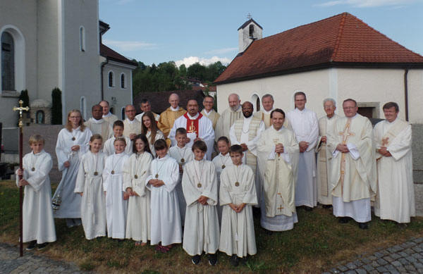 | Gruppenfoto der Priester und Diakone und Ministranten vor der Kirche – Mitte Pfarrer Josef Drexler, rechts von ihm Dr. Konrad und links Prälat Gottfried Dachauer. - Foto: Sepp Schlecht | |||||