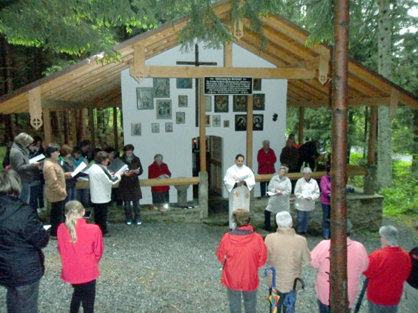 Marienlieder, unter der Leitung von Regina Christof, an. Ehe er den Segen erteilte dankte Pfarrer John den Besitzer der Kesselbodenkapelle, der Familie Baumgartner, für die Vorbereitungen und Arbeiten. Ebenso galt sein Dank den Mesnerinnen für das Vorbeten den Gebetstexte. Gleichfalls galt sein Dank dem Kirchenchor für die musikalische Ausschmückung der Maiandacht und allen Gläubigen für ihr Kommen und Mitbeten |