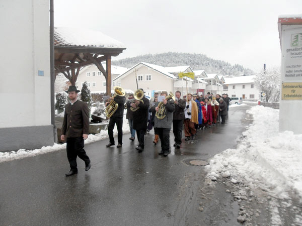 | Nach dem die Gäste von den Verwaltungsangestellten mit Sekt versorgt waren, marschierten alle, voran die Pfahlspatzen und Sternsinger, zur Kirche, wo Abt Hermann-Josef und Pfarrer Josef Drexler den Pontifikalgottesdienst zelebrierten. | |||