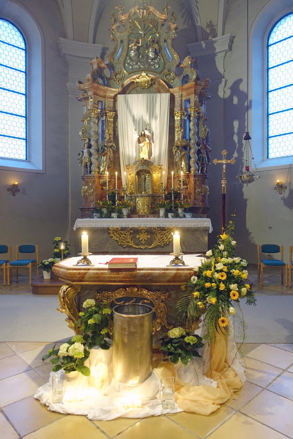 Volksaltar und der Hauptaltar am Ostermorgen mit dem Weihwasser vor dem